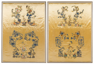 A Rare Set of Six Chinese Imperial Yellow Embroidered Silk Panels