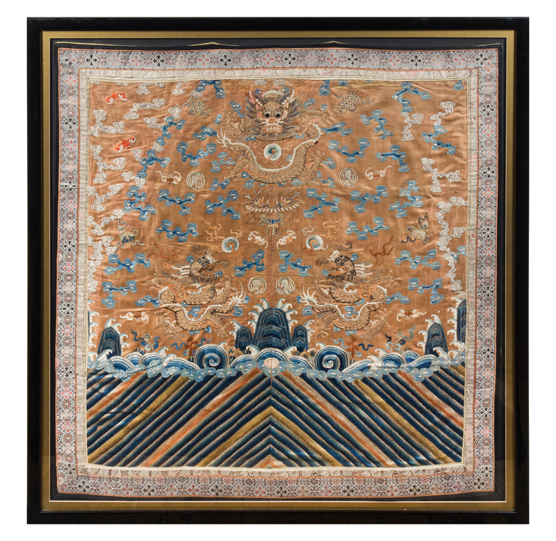 worked in multi-color threads depicting a sinuous dragon and a pair of confronting dragons amongst auspicious clouds, above mountain peaks emerging from crashing waves and beribboned Buddhist emblems, with lishui stripes to the lower register.
