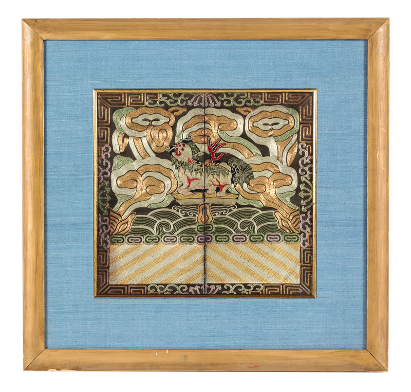 worked in multi-color threads showing a central lion standing on a platform surrounded by ruyi clouds above waves, frames.