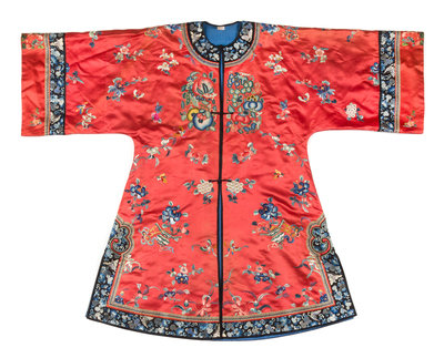 worked in Peking knots and satin stitch with multi-color threads depicting grapes, peaches, pomegranates and lychee borne on leafy vines above butterflies and floral sprays, all against a red ground, the collar and the borders embroidered with butterflies and flowers picked out on a black ground.
