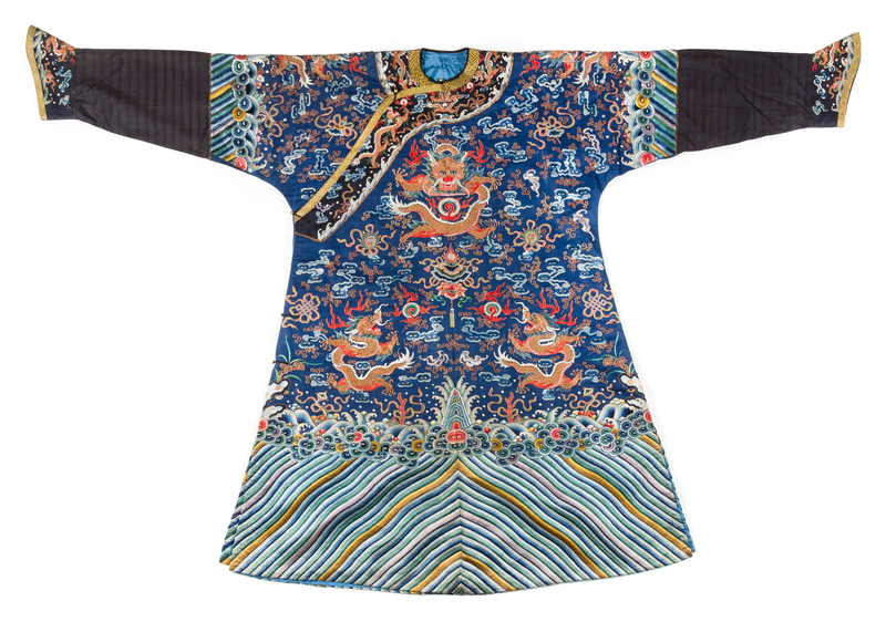 worked in multi-colored threads showing nine sinuous dragons chasing the flaming pearls amongst clouds, flying bats and ribbon-tied Buddhist emblems, all reserved on a blue ground above mountain peaks and crashing waves, the hem embroidered with lishui stripes, the collar and borders decorated with further dragon design against a black ground.