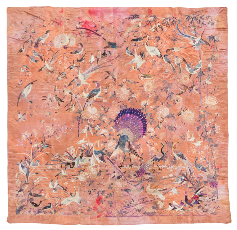 of rectangular form, worked to show pheasants and birds perched on flowering branches reserved on a pink ground.