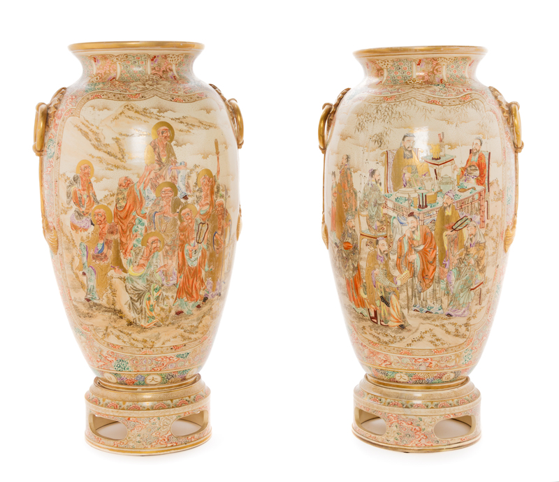 each of baluster form, decorated to the front and back with large reserves showing various monks, divided by dense floral patterns, flanked by a pair of gilt loop-form handles, raised on a circular base with reticulated panels.