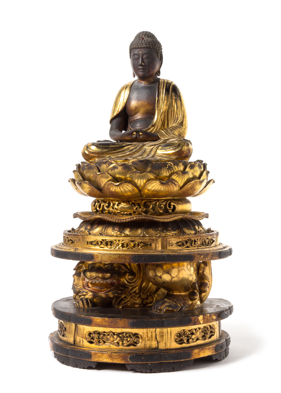 seated in dhyanasa with flowing robes that pool around his feet on a lotus seat above a multi-tiered platform situated on the back of a snarling shishi, The urna and the jewel of wisdom adorning the ushnisha wrought in semiprecious stones.
