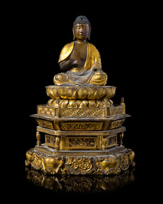 depicted seated on a two-tier lotus throne on top of a multi tiered platform, the figure draped in flowing robes with the right arm raised and the left settled on the knee, the urna inset with a semiprecious stone, the underside of the statue inscribed in black ink.