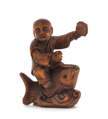 depicting a boy standing on a carp, incised with a two-character maker's mark to the underside.