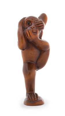 the animal depicted standing on one foot with the left hand covering the left eye, incised with a two-character maker's mark to the underside.