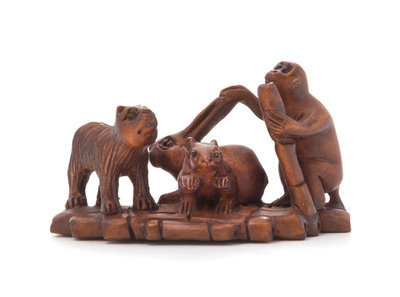 depicting a monkey, a dog, a rabbit and a mouse on a bamboo shaft.