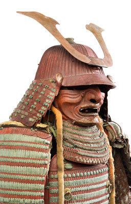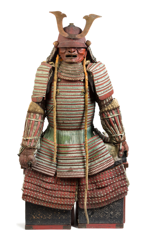 comprising an iron semi-spherical helmet bowl (kabuto); a red lacquered iron whole face mask (menpo) with tiered iron plate throat guard connected by green and red braid; a two-piece cuirass (do) laced with green and red braid; two lower arm guards with iron plates following the profile of the arms; two shoulder guards (sode) also laced with same color braid; two thigh guards (haidate) of closely laced lacquered iron rectangulars; together with two fitted boxes.