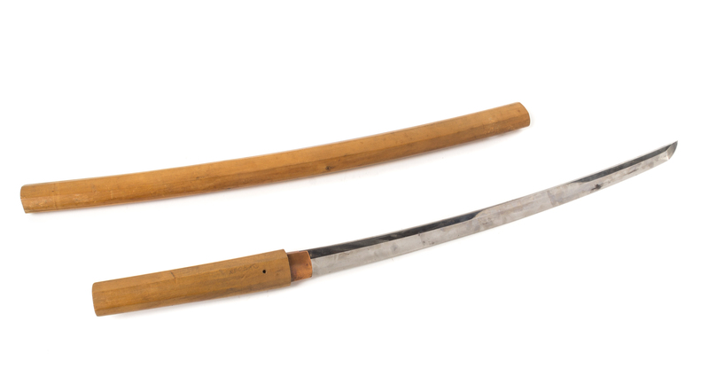 with a blade of shinogi-zukuri shape having a hamon of midare fashion and mounted with a copper habaki; the mune of ihori form and the boshi of yakizume shape; the handle of the shirasaya inscribed in pencil with an identifying label XDOBKO and a mekugi placed in the mekugi-ana; the nakago bearing two mekugi-ana and inscribed with a six-character makers mark on one side with a chrysanthemum stamp on the other.