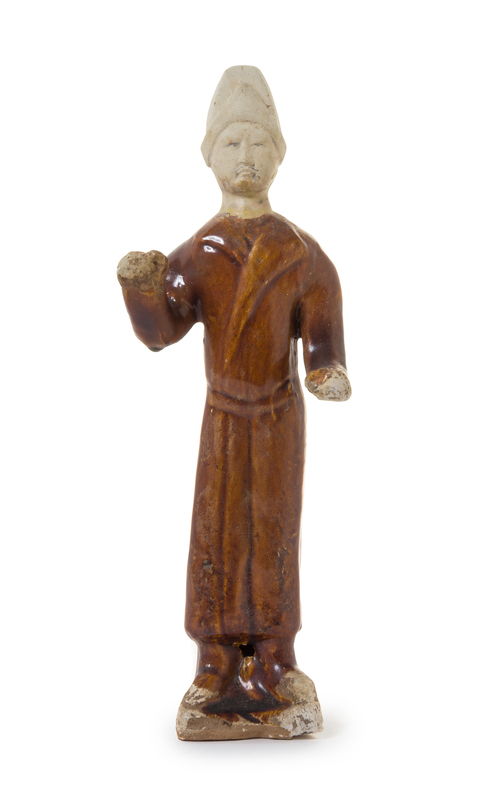 the figure depicted standing with the right hand raised, dressed in amber glazed robes.
