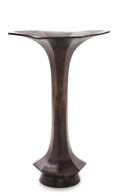 having a lobed outline, the compressed body rising to a flared mouth, the underside cast with a maker's mark.