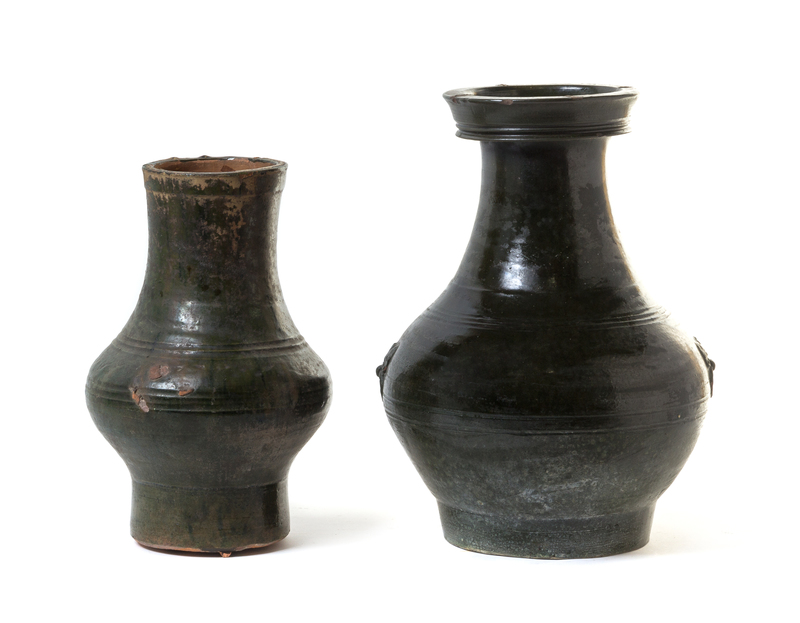 each having a baluster body supported on a short foot, decorated with concentric rings, the larger vase set with a pair of mask-form handles with mock rings, capped with a dished mouth.