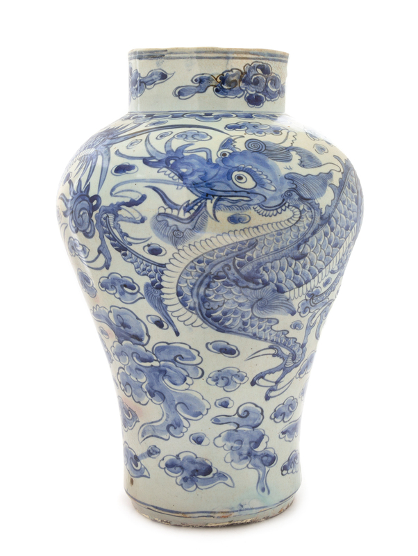 having broad shoulders capped with a straight mouth, painted overall with two dragons in pursuit of flaming pearls surrounded by clouds.