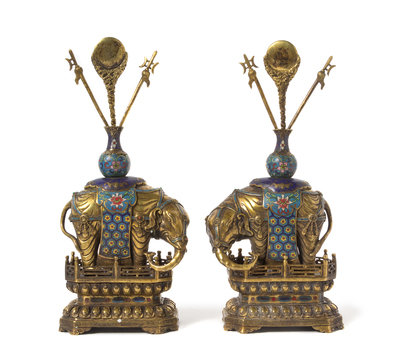 A Pair of Gilt Bronze and Cloisonne Enamel Models of Elephants