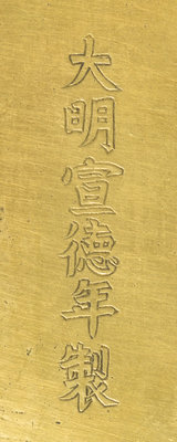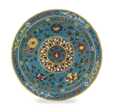 decorated with a centered flower head enclosed by two rows of petals, further surrounded by colored lotus scrolls and a border of stylized dragons, all reserved on a celeste blue ground, the underside incised with a vertical Xuande six-character mark circled by a band of scrolling lotus blossoms.