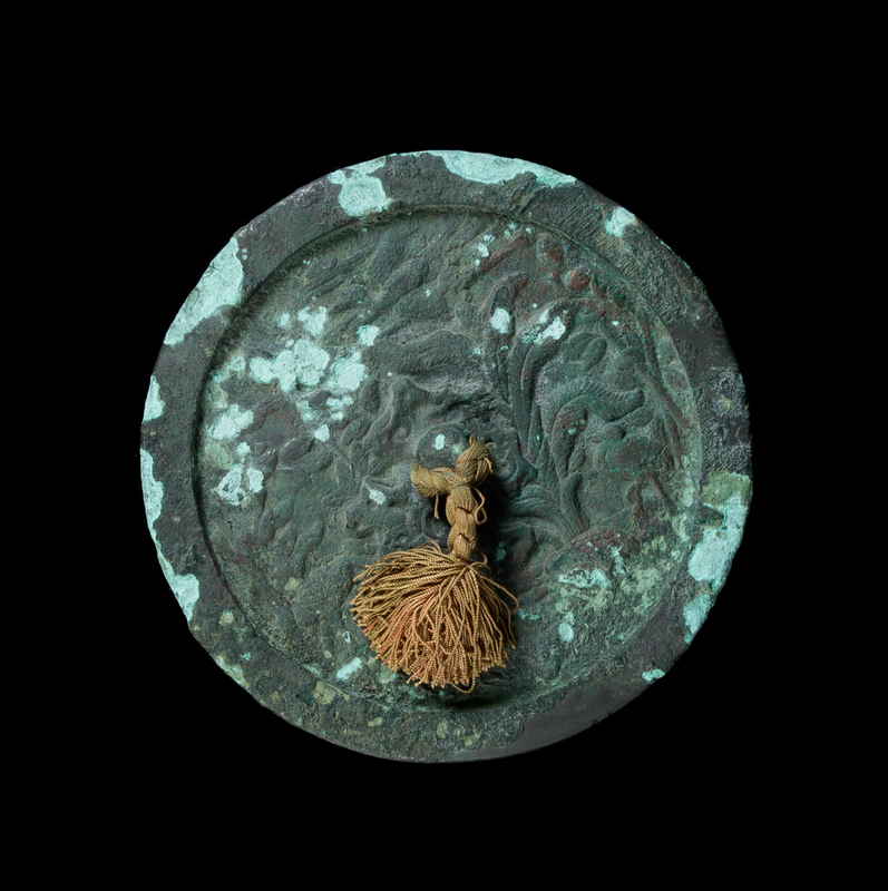 the reverse depicting birds in a flowering landscape, a tasseled rope through the central loop, together with an archaistic bronze wine vessel.