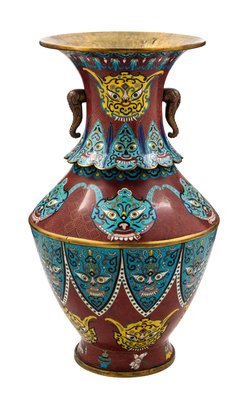 of baluster form, decorated with the faces of snarling mythical beasts, with two applied elephant-head handles on the neck.