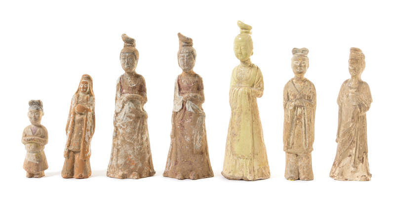 comprising four figures of court ladies and three figures of male attendants, each standing and dressed in draped robes.