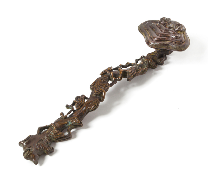 molded as a gnarled tree branch with entwined lingzhi sprigs and a scepter head showing a large lingzhi.