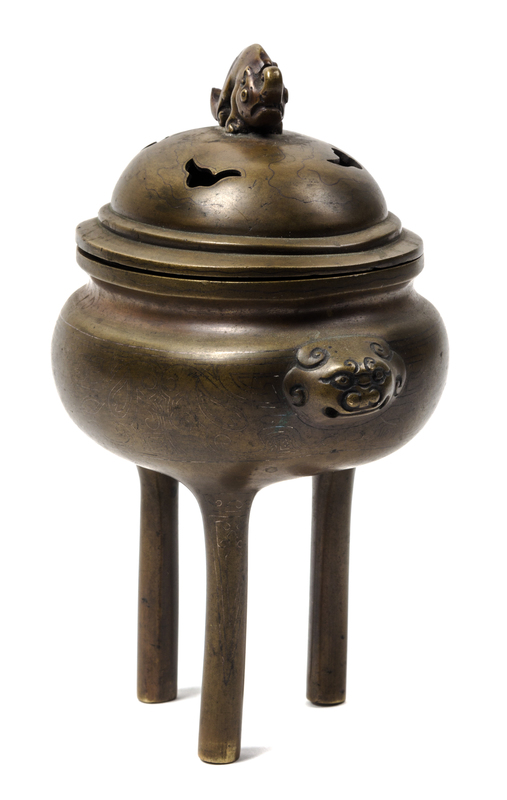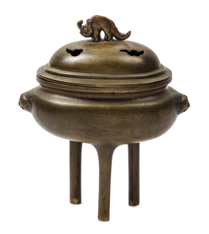 of squat rounded form, raising to a waisted neck surmounted by a domed lid with a chameleon-form finial, two mythical beast-form handles to the body, raised on three elongated straight legs.
