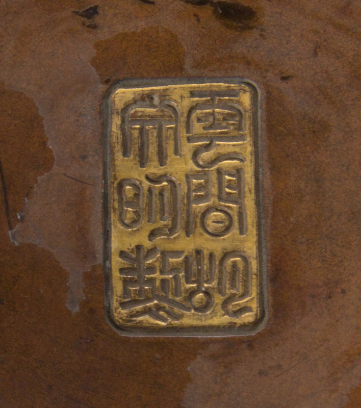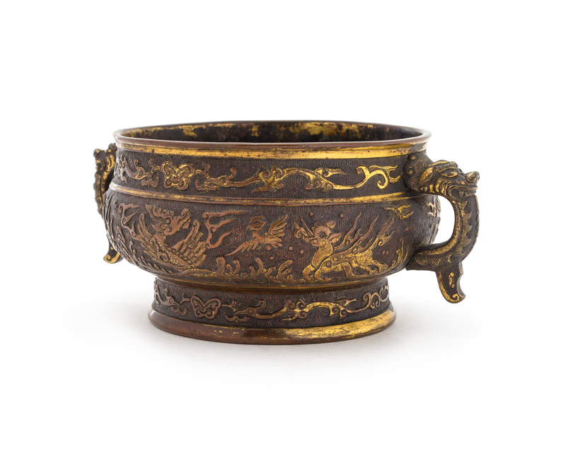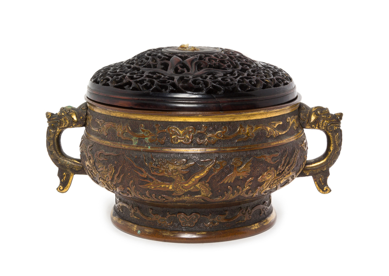 of archaistic gui form, the compressed globular body raised on a flared foot surmounted by a lipped mouth rim, the sides finely cast in relief with a central panel showing birds and mythical beasts above waves, between two bands of stylized phoenix birds flanking butterflies, all set above a geometric diaper ground, flanked by a pair of dragon-head handles, the underside incised with a six-character maker's mark reading Yunjian Hu Wenming zhi (Made by Hu Wenming of Yunjian) within a gilt rectangular panel, together with a reticulated hongmu cover.