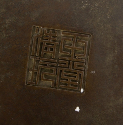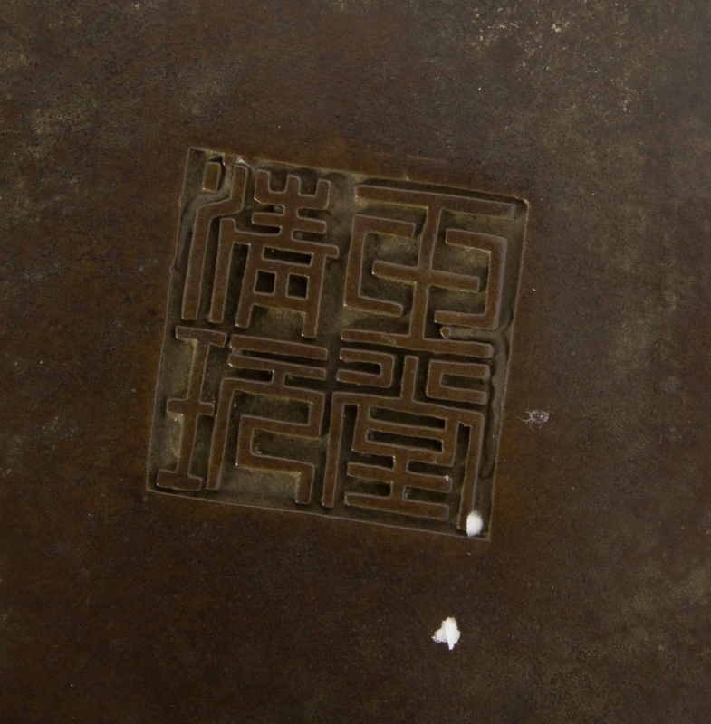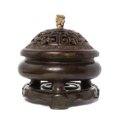 the compressed body rising to a recessed neck and straight mouth, supported on three curved feet, the underside cast with a ya tang jing wan four-character hall mark, raised on a fitted bronze stand, the hardwood cover pierced and carved with stylized dragons between clouds surmounted by a hardstone finial caved in the form of lingzhi.
