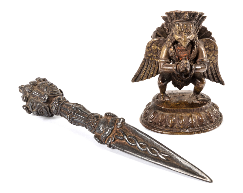 comprising a figure of bodhisattva Garuda standing on a lotus base with both hands clasped in front of his chest with wings wide open; a purbhu cast with multi-faced deity.