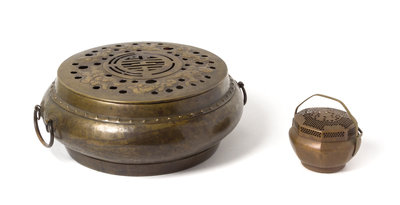 comprising a large incense burner and a small hand warmer.
