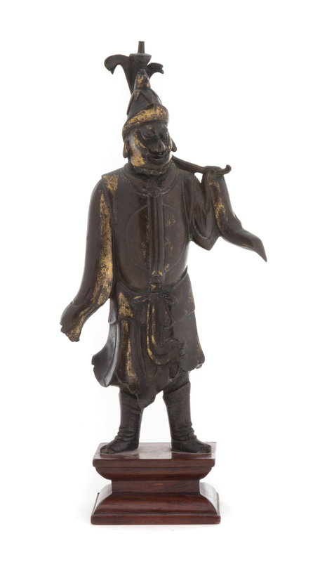 the partially gilt figure depicted standing wearing armor and a peaked helmet, the face with a wide smile