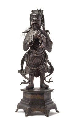 the figure depicted standing on a hexagonal plinth, wearing flowing, windswept robes, with flowing facial hair.
