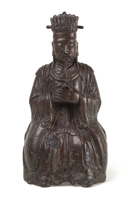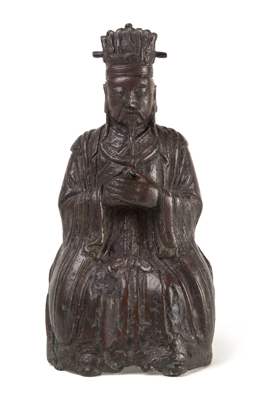 the figure seated with both hands raised and folded in front of his chest, wearing an elaborate hat.