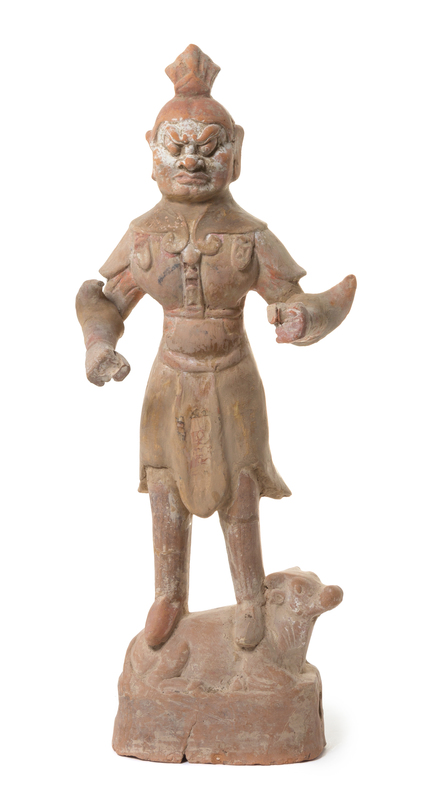 the figure depicted standing on a recumbent ox and wearing full armor, both hands raised, the face having a serious expression with bulging eyes between bushy eyebrows and a big nose, surmounted by a top knot.