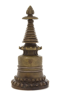 the bell-form base supported on a double lotus base and decorated with ribbed silvered metal inlaid central bands below incised beaded jewelry and characters, the shaped harmika rising to a conical spire and a lotus bud finial with a lotus petal flange.