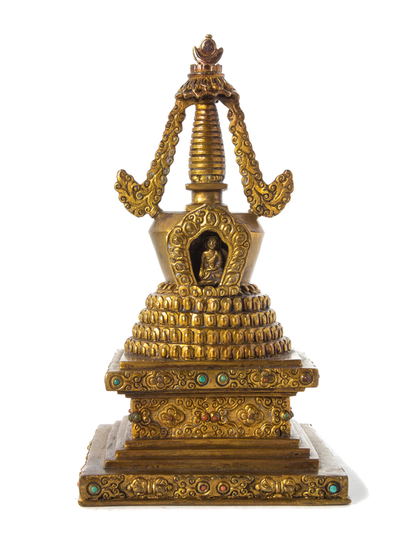 the stupa containing a seated deity, raised above four rows of lotus petals, further supported on a waisted pedestal cast with flower head inlaid with hardstones and vajra, surmounted by a tiered spiral topped with a canopy and flanked by garlands and capped by the sun-moon finial.