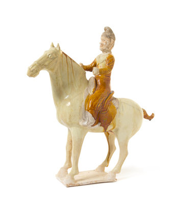 depicting a male figure dressed in amber toned loose robes, his both hands raised, riding on a standing horse with its head facing forward, the horse figure covered in light creamy yellow glaze.