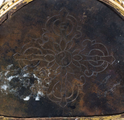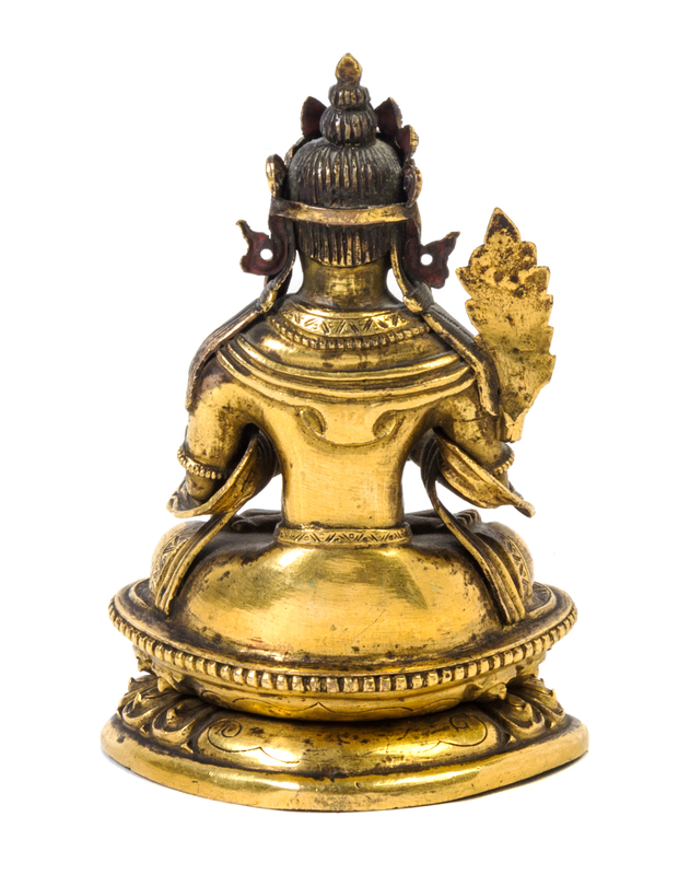 the figure depicted seated in dhyanasana on a double lotus plinth, wearing a dhoti, the hair pulled in a high chignon, surmounted by a hardstone inset headdress, the underside sealed.
