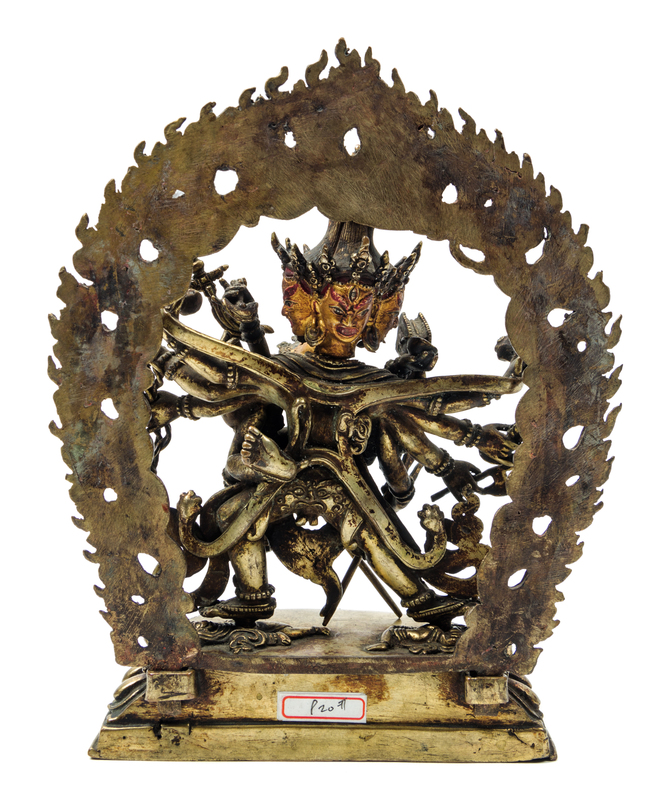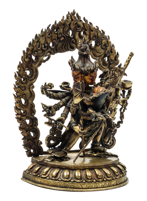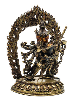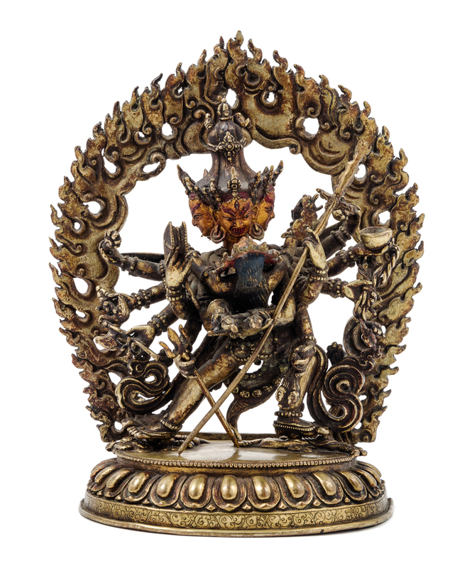 the wrathful figure standing in alidhasana on prostrate figures atop a single lotus plinth, his principle arms holding his consort and his hands grasping a bell and shaker, the other hands grasping various items including an animal foot, a staff, a cup, a knot, a group of heads, and a chopper, wearing elaborate beaded jewelry and an elephant skin, the face with a fierce expression, bulgy eyes and enlarged nostrils, his mouth wide opened revealing his teeth, his hair secured by a skull crown surrounded by three faces, behind him a mandala of flames, cast in two sections, the base sealed.