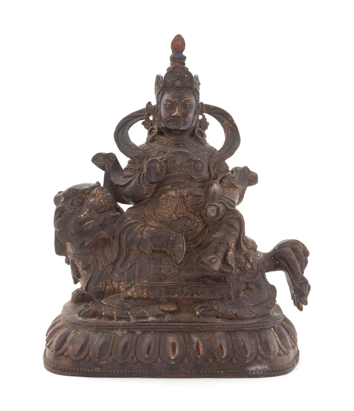 the deity cast seated on a fierce lion, further raised on a lotus base, his right hand raised in front of his chest and the left hand lowered holding a mouse, wearing a full armor and an elaborate tiara, the naked upper body adorned with beaded jewelry.