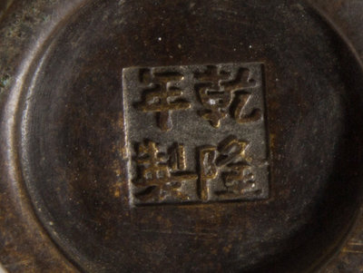 cast as two component vases joined by a gilt highlighted chilong and a phoenix decorated with elaborate archaistic scrolls extending across the two vases, interspersed with animal masks bearing mock rings, the larger vase cast with an apocryphal Qianlong four-character mark within a square, raised on a fitted bronze stand supported on ruyi feet.