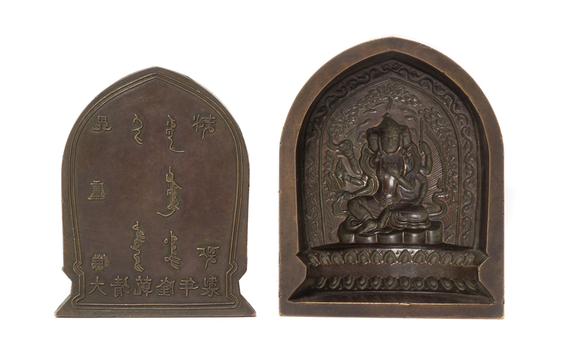 the center cast with a seated Bodhisattva set atop a double lotus base, underneath foliate scrolls, the base incised with a Qianlong six-character mark, the front of the handled lid incised with two characters reading yin yi, the reverse chased with four vertical lines of inscriptions above a second Qianlong six-character mark.