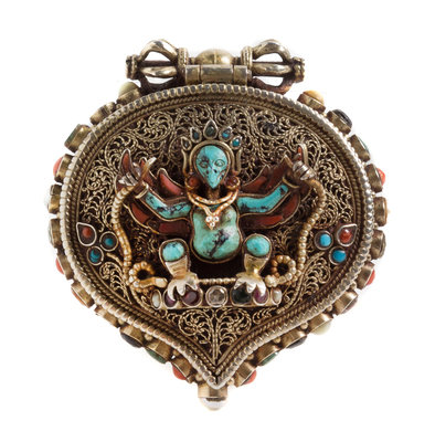 the front of the cover decorated with a central wrathful deity standing with both arms stretched, the reverse chased with a Tibetan character, the interior of the box decorated with a seated Tara surrounded by floral sprays, the underside with three characters, surmounted by a vajra, inset with turquoise, pearl, hardstone and colored glass.