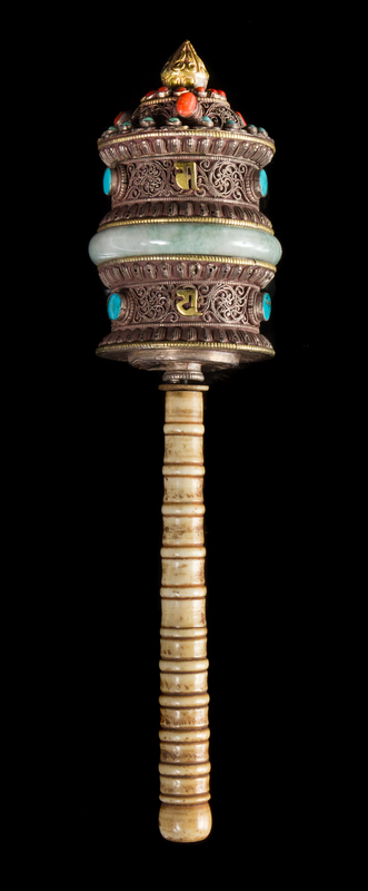 A Tibetan Hardstone and Bone Inset Gilt Metal Prayer Wheel
