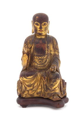 the figure depicted seated at ease with his right feet resting near the left knee, the right hand raised and the left hand bearing a ball, dressed in draped high-waisted garments with a shawl covering the shoulders, the face with a calm expression, raised on a fitted hardwood stand.