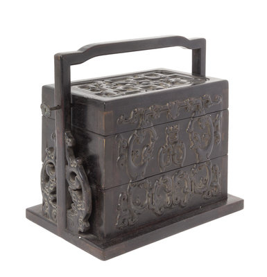 of rectangular form, comprising a single compartment, set on a base frame flanked by reticulated carved spandrels depicting dragons, a pin through the cover secured through the humpback handle.