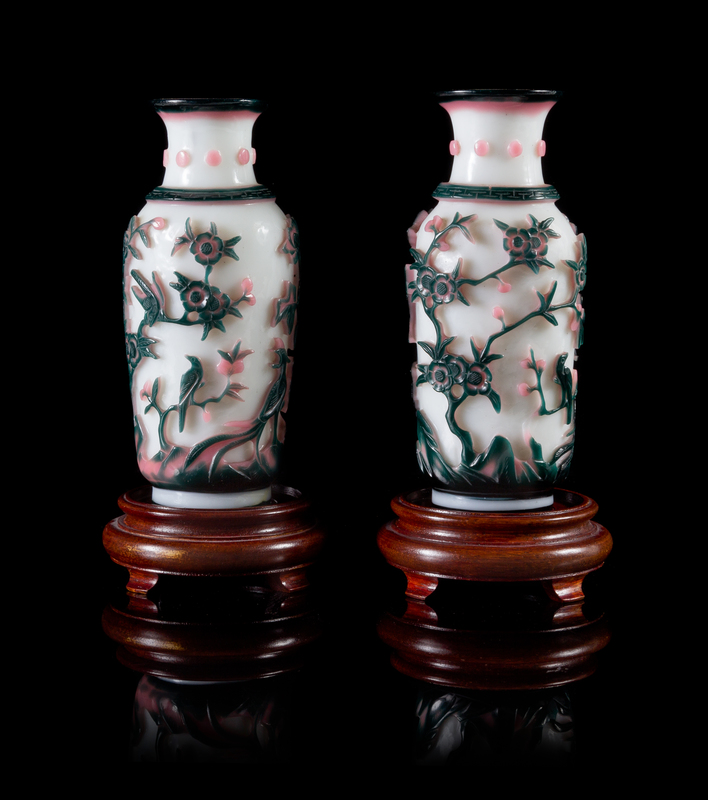 A Pair of Pink and Green Overlay White Peking Glass Vases