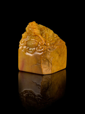 of square form, the top carved to show a crouching dragon amongst clusters of clouds.