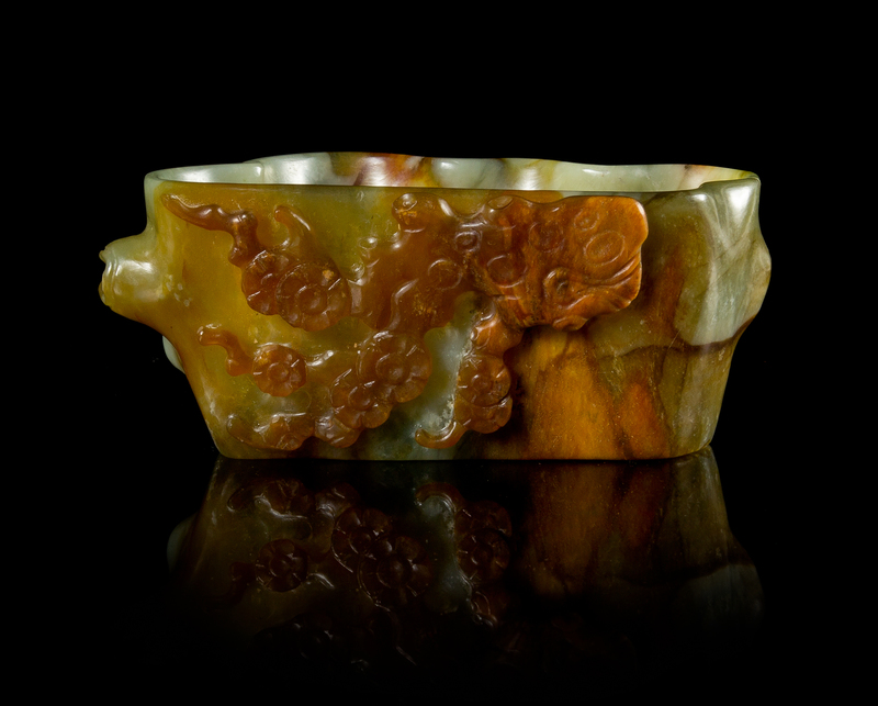 of a mottled celadon stone, carved to the russet skins highlighting prunus branches.