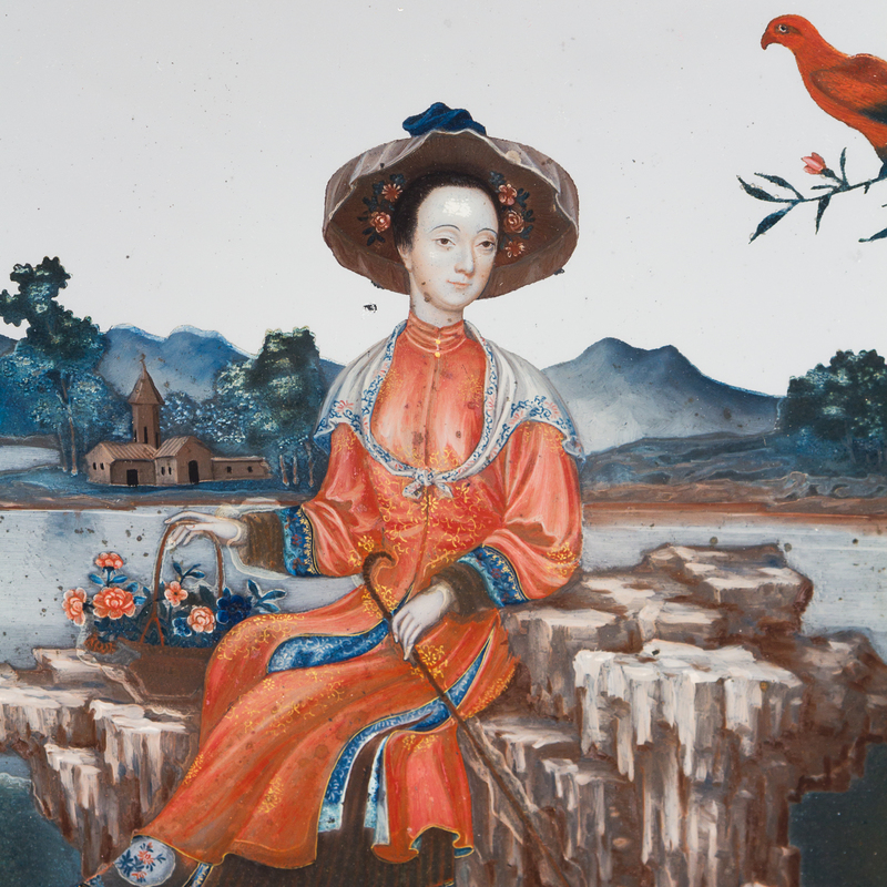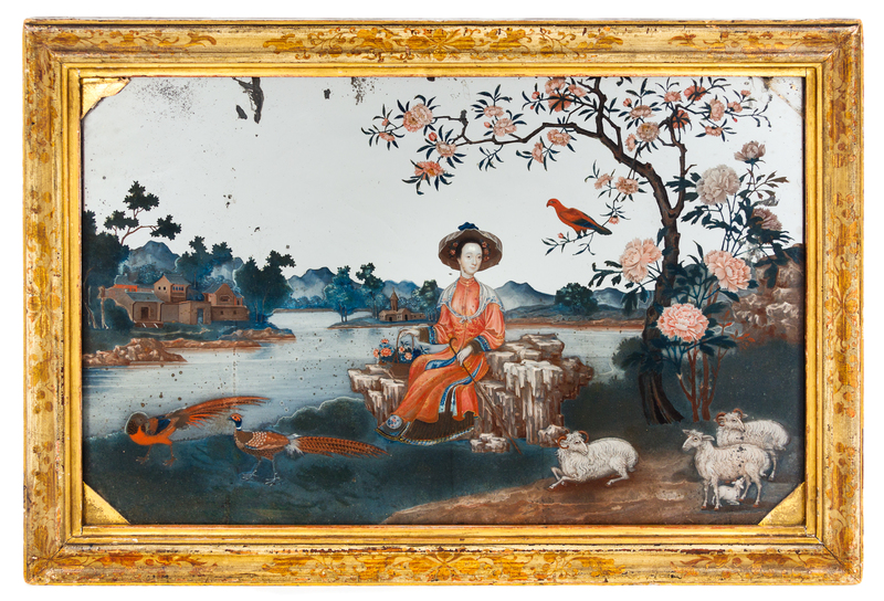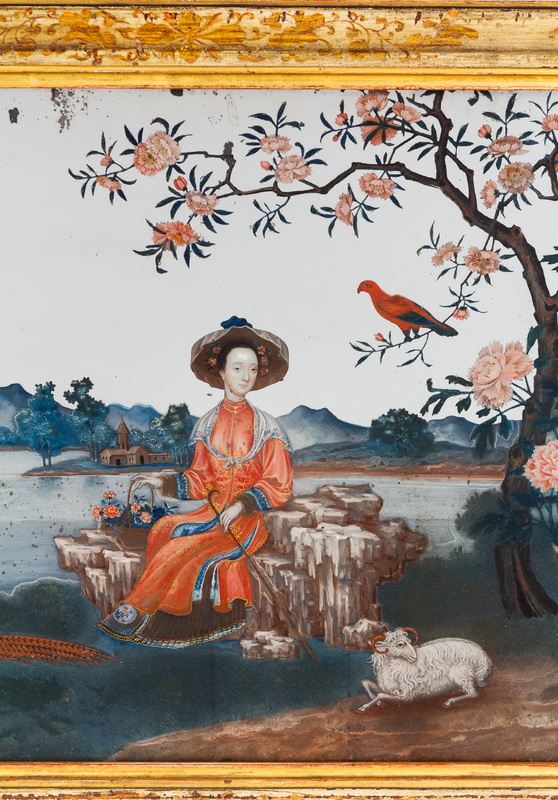 of rectangular form, painted to the center with a lady seated on rockworks underneath a flowering peony tree with a bird perched atop, her right hand bearing a flower-filled basket and her left hand holding a staff, surrounded by various goats and pheasants, the background painted with a riverscape with houses and mountains, set within an European gilt wood frame.