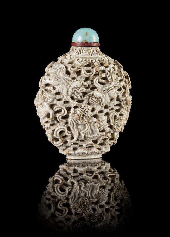 of flattened circular form, molded in relief with a continuous scene showing nine fu lions playing with ribbon-tied brocade balls, the underside bearing a Jiaqing four-character iron red mark.